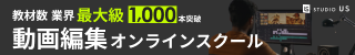 動画編集オンラインスクール studio US:[PR]完全オンラインで、自宅で24時間好きな時に学べる。最短2ヵ月でプロのスキルを習得できる。受講料が大手と比べて安い。教材が豊富(300本以上)。ポートフォリオをたくさん作れる。仕事を獲得するサポートがある。