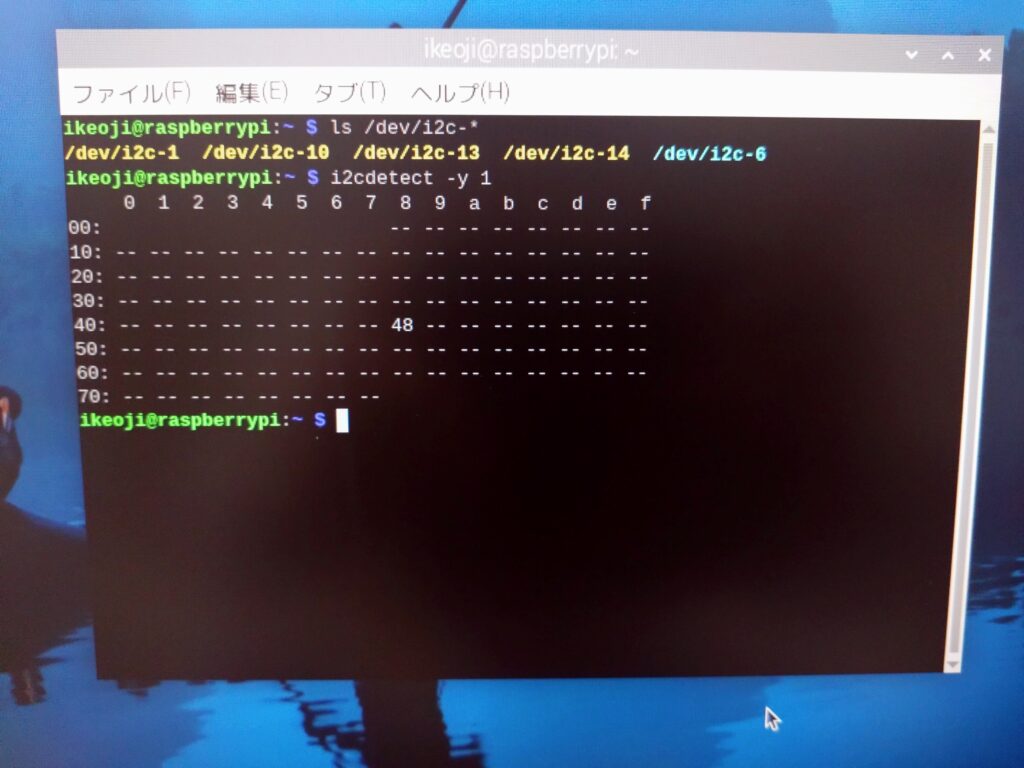 3. Pythonプログラムで通信する時は、そのアドレスを指定します。例:デフォルト(0x48)の場合 I2C_ADDR = 0x48