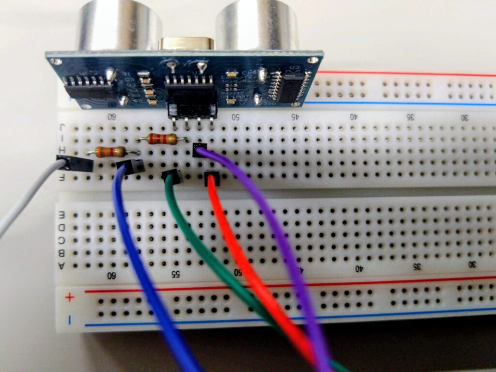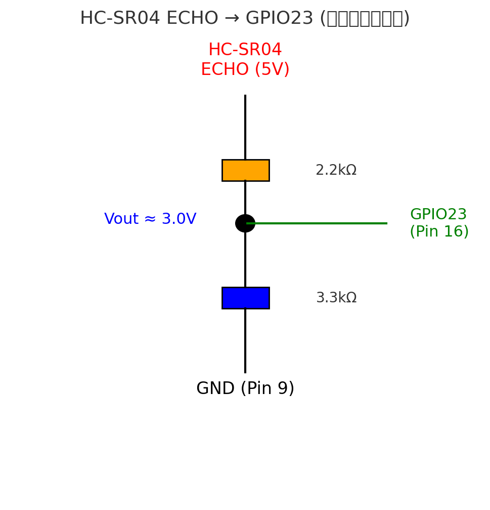 HC-SR04 の ECHO ピンは 5V 出力なので、Raspberry Pi の GPIO(3.3V 仕様)に直接つなぐと破損の恐れがあります。そのため、抵抗で分圧して 3V 前後に落とす必要があります。
